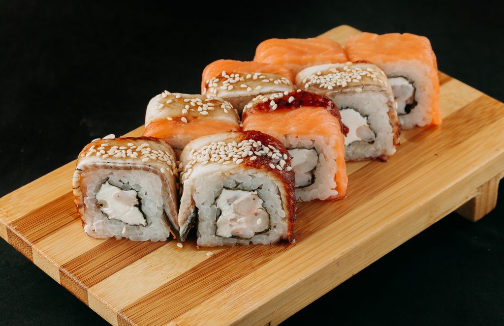 хит Честер Ролл 1+1=1 1 150 ₽ 2 300 ₽ В корзину Купить в 1 клик В корзину Купить в 1 клик Описание Описание Угорь, лосось, салатная креветка, сливочный сыр, кунжут, унаги соус