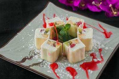 Минари 410 ₽ В корзину Купить в 1 клик В корзину Купить в 1 клик Описание Описание Рисовое тесто, сладкий сливочный сыр, киви, вишня, банан, кокосовая стружка
